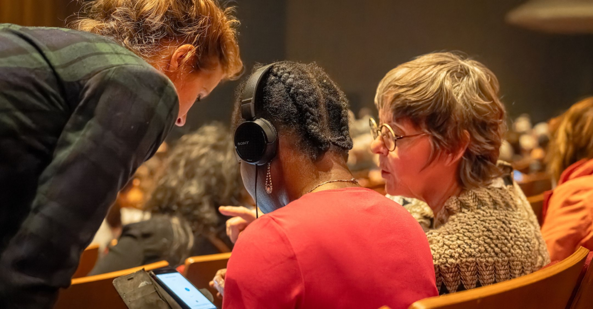During the show, the group sits together in a designated section of the theatre. Equipped with headphones connected to a smartphone, they can hear both the show’s soundtrack and the live audio description. A nearby team ensures their comfort and is ready to help with any technical issues.